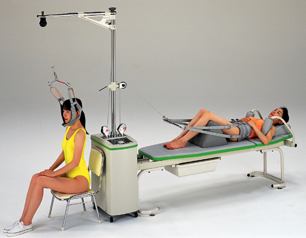 脊椎(背骨)への牽引治療で細かく休みを入れながら(間欠牽引)頸椎や腰椎に行われます。頸椎・腰椎などの変形性脊椎症、椎間板ヘルニアなどの痛みやしびれに効果があります。